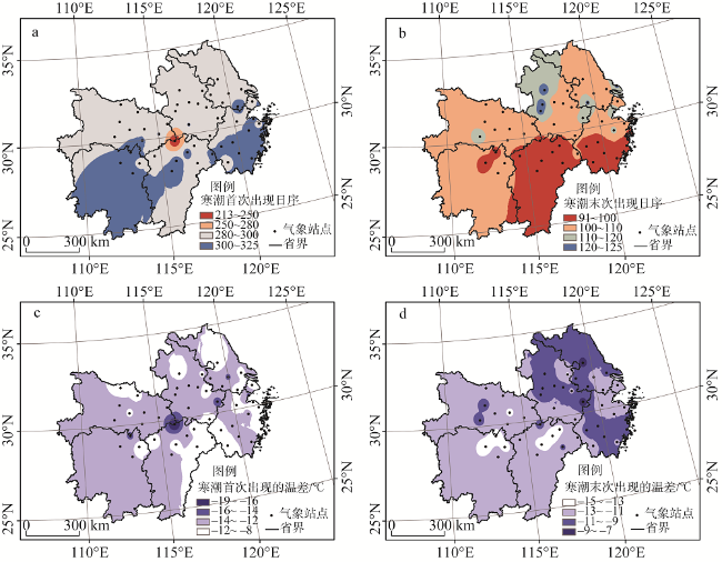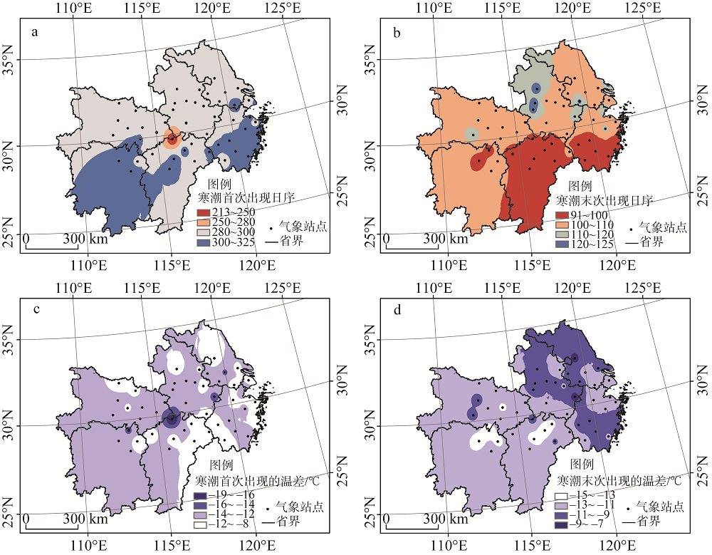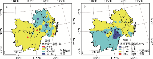 图2 1958—2015年长江中下游寒潮发生频次及平均最低气温温差的空间分布Fig. 2 Spatial distribution of cold wave occurrence frequency and difference of average minimum temperature in the middle and lower reaches of Yangtze River from 1958 to 2015 |