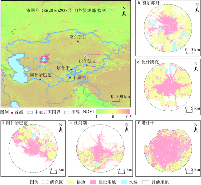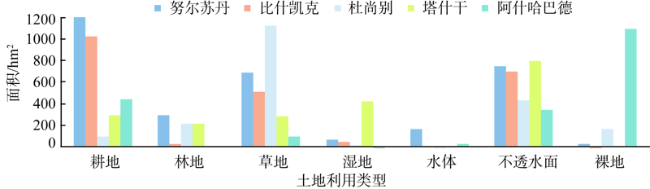 表4 2010—2015年研究区土地利用变化率结果Table 4 Land use change rate in the capitals of five Central Asian countries between 2010 and 2015 |