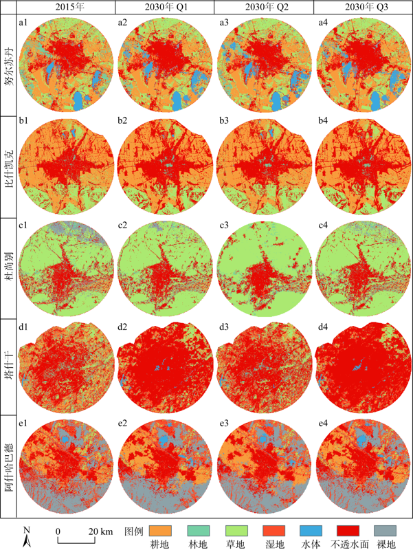 | 情景 | 耕地 | 林地 | 草地 | 湿地 | 水面 | 建设用地 | 裸地 | |