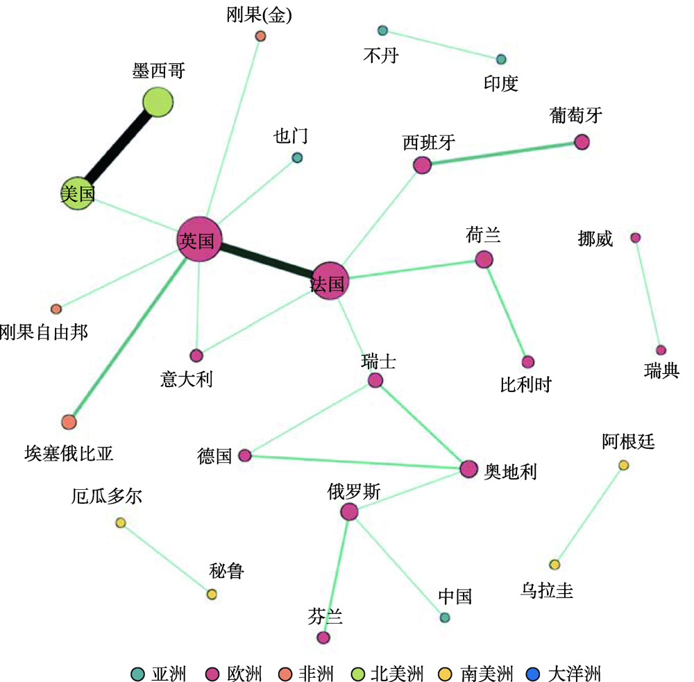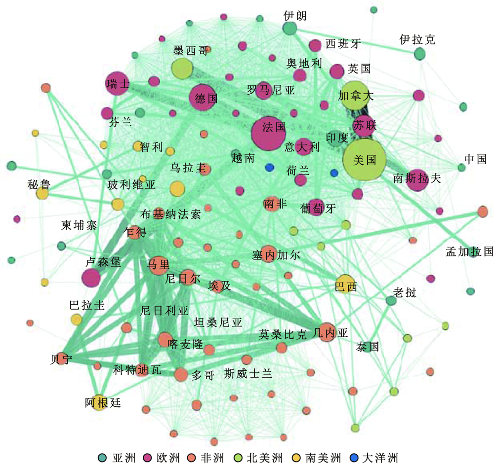 表2 1820—2017年全球跨界水合作网络的特征量统计Table 2 Statistics on the characteristics of international transboundary water networks from 1820 to 2017 |
