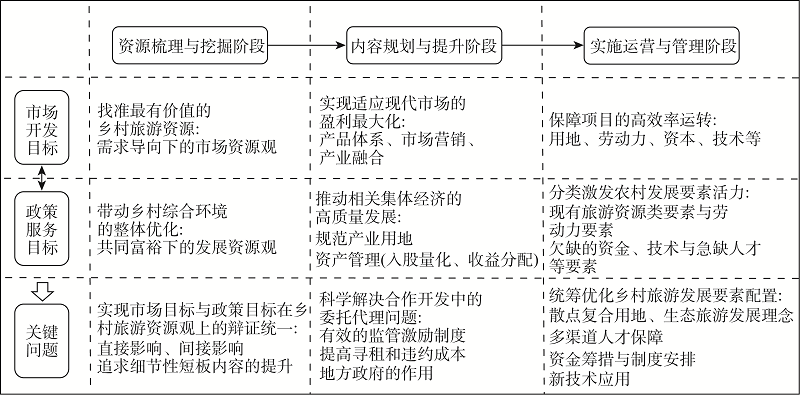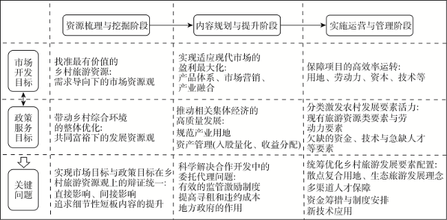 To discuss the development trend of rural tourism in the new stage of solidly promoting common prosperity, we should continue to strengthen the service role of rural tourism from the perspective of reform. Starting from the practical logical framework of developing rural tourism, this paper makes a phased comparative analysis from the two perspectives of market development objectives and policy service objectives, which will help to find out the key issues to strengthen the policy value of rural tourism. It is found that, in the stage of combing and mining resources, to achieve the dialectical unity of market objectives and policy objectives in the view of rural tourism resources, we need to actively strengthen the positive effect of developing rural tourism, and seek to improve and enhance the detailed short board content in rural areas. In the planning and design stage of rural tourism, to scientifically solve the principal-agent problem in the cooperative development of rural tourism, it is necessary to clarify the relationship between the responsibilities, rights and interests of the cooperative parties, and solve the problem of information asymmetry by improving the supervision and incentive system, enhancing information transparency, and increasing the cost of rent-seeking and breach of contract. In the stage of operation and management, we should plan and optimize the allocation of rural tourism development factors, and take multiple measures in intensive land use, attracting and cultivating professionals, diversified fund-raising, innovative technology application, etc.