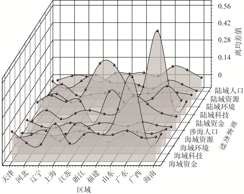 福建 | 海域资金>陆域科技>陆域资金>海域科技>陆域人口>涉海人口>海域资源>陆域资源 | 陆海要素交互驱动,海域要素驱动主导 | |