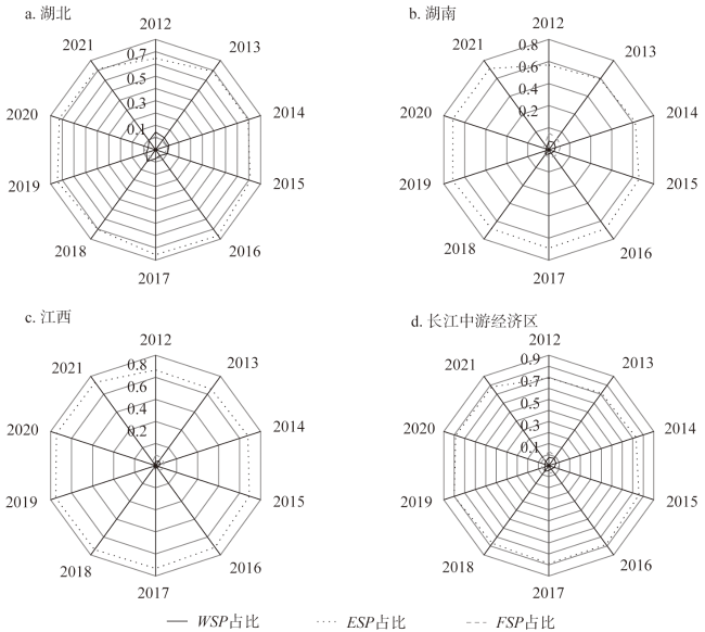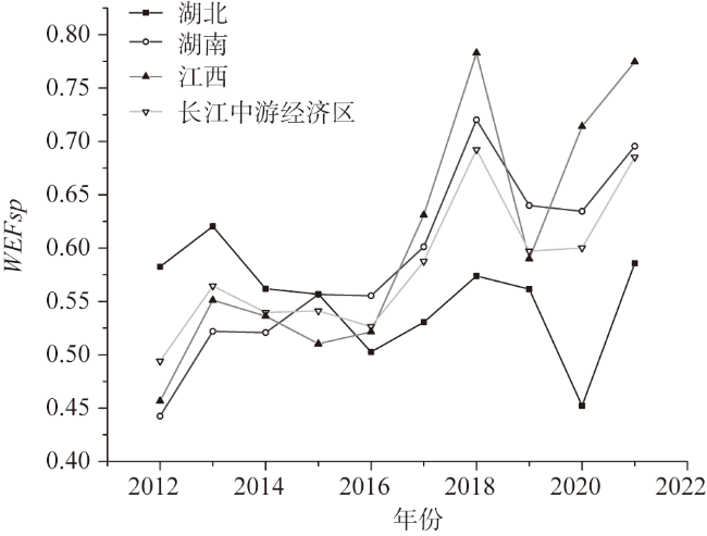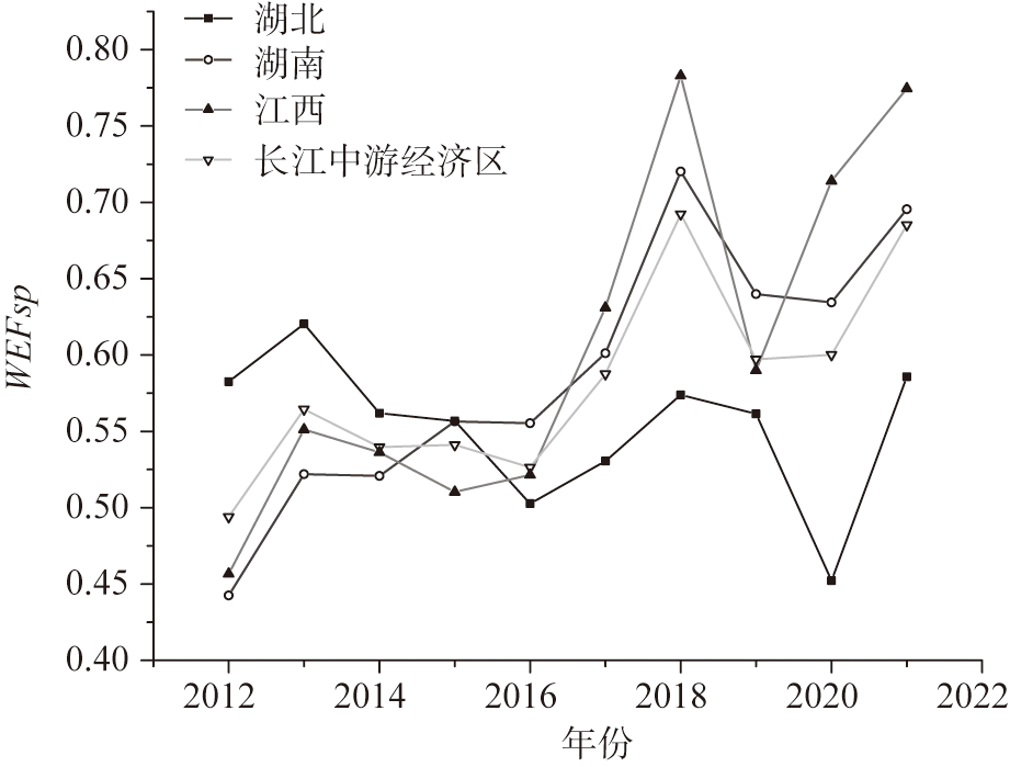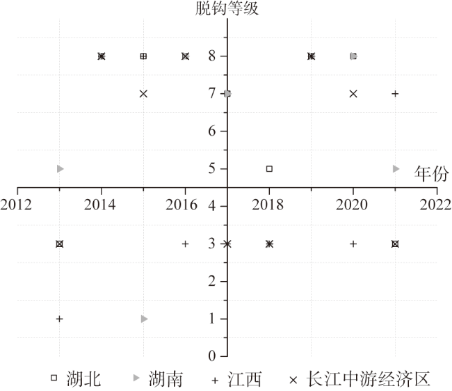 表3 湖北、湖南、江西三省2013—2021年WEF系统压力与绿色转型质量脱钩指数Table 3 Decoupling index of WEF system pressure and green transformation quality in Hubei, Hunan and Jiangxi provinces from 2013 to 2021 |