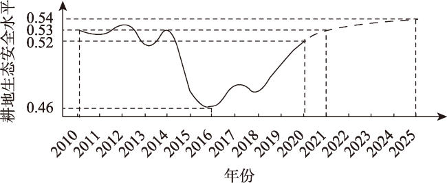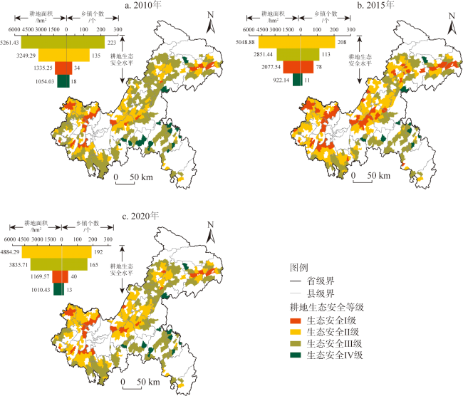 表2 2010年、2015年、2020年耕地生态安全水平分级Table 2 Classification of cultivated land ecological security level in 2010, 2015, and 2020 |