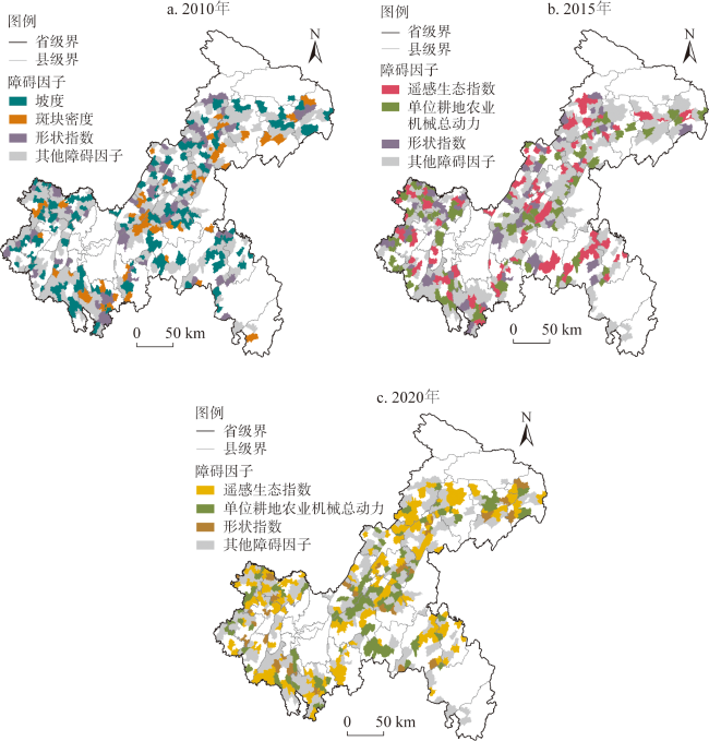 表3 2010年、2015年、2020年耕地生态安全水平主要障碍因子障碍度排序Table 3 The rank of dominant limiting factors for the cultivated land ecological security level in 2010, 2015, and 2020 (%) |
