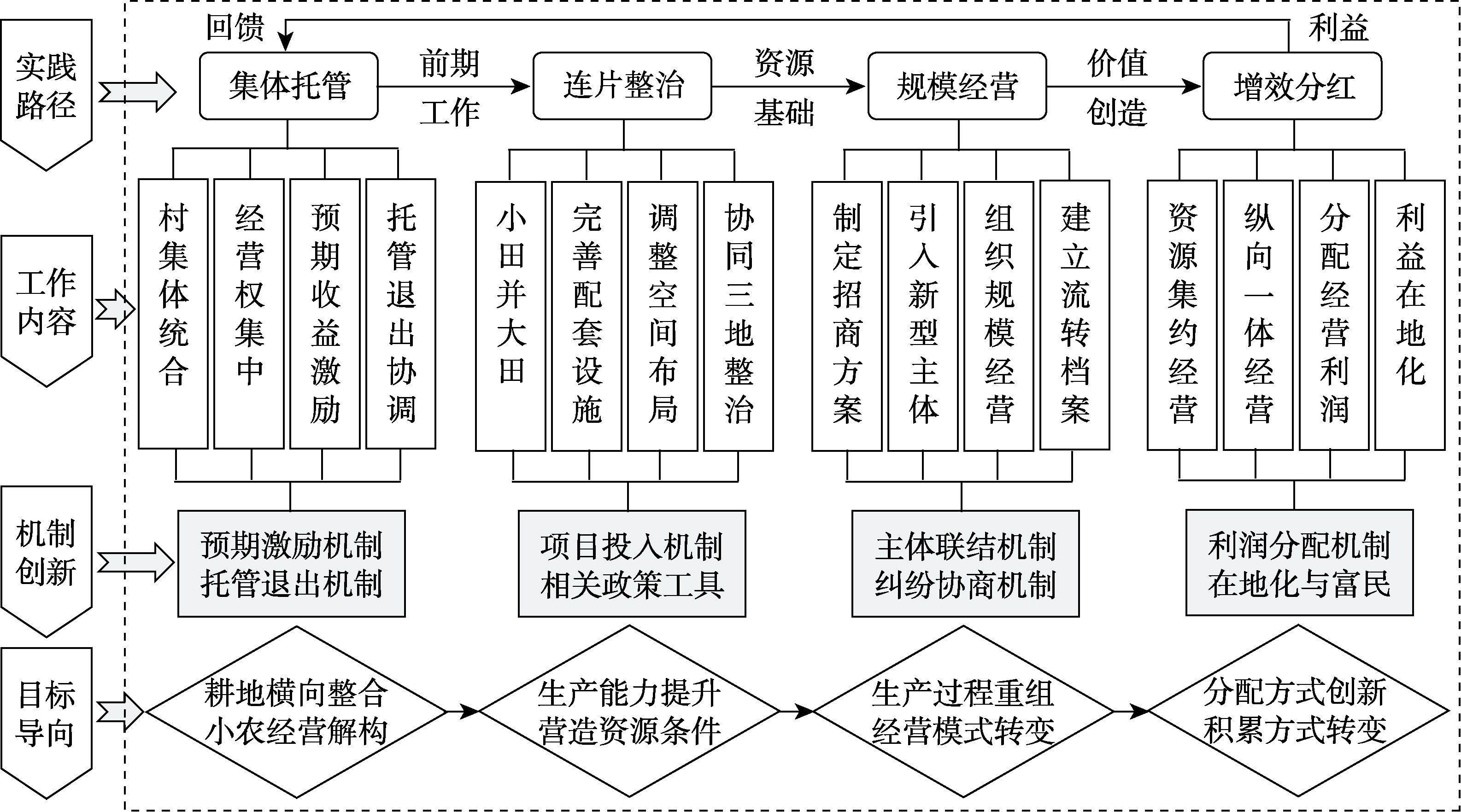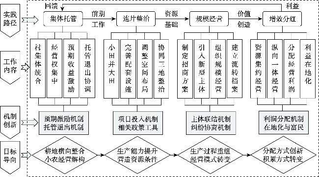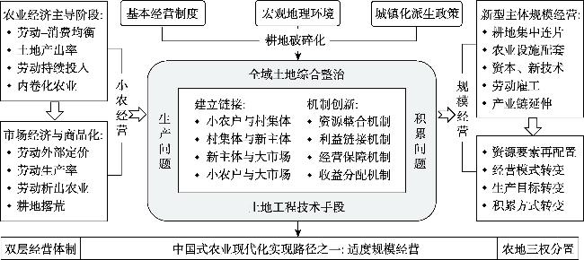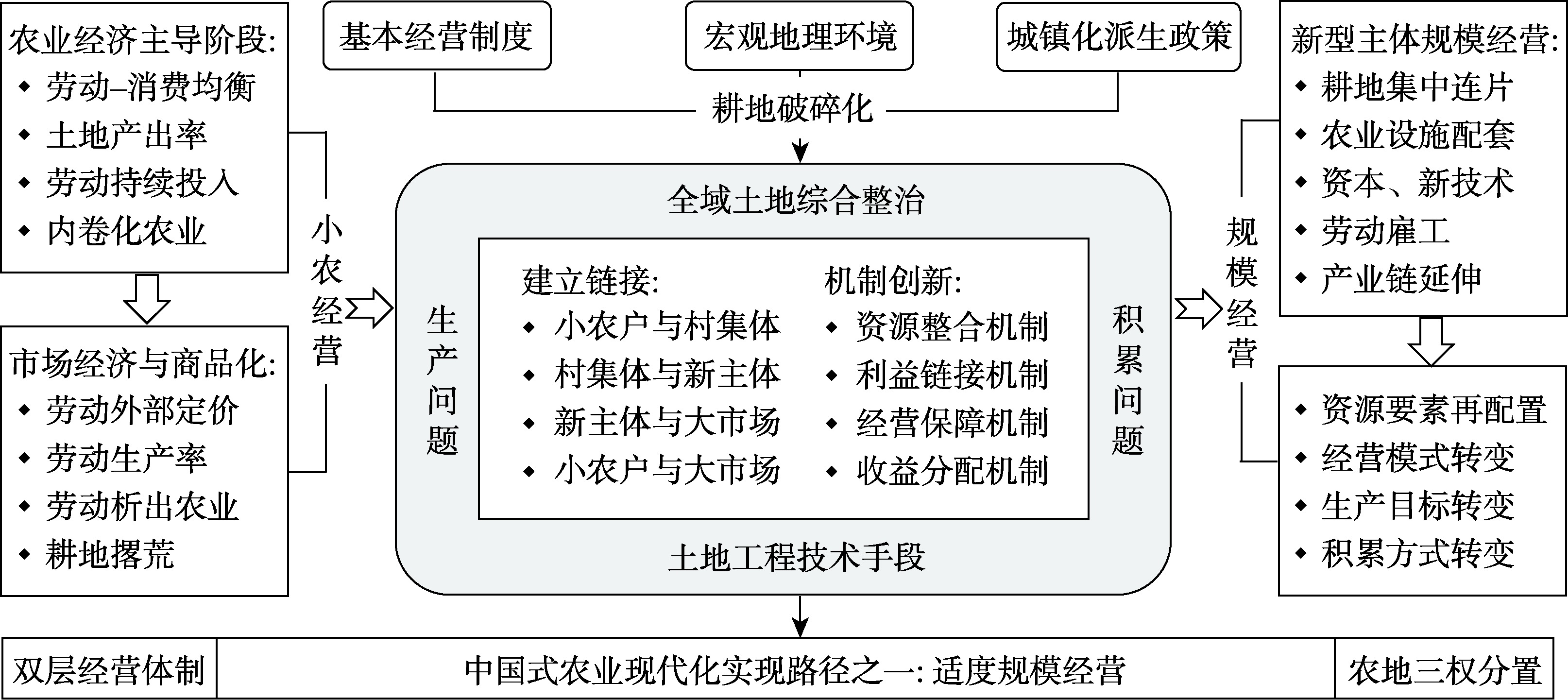In the new period, the comprehensive land consolidation has been an important policy tool to promote agricultural transformation and rural revitalization. Focusing on the problem of cultivated land fragmentation, this paper aims to explain the mechanism of comprehensive land consolidation in promoting agricultural scale operation from two dimensions of resource reallocation and operating mode transformation, and then refine the path model and innovation mechanism of the comprehensive land consolidation in the case area. The research methods include theoretical analysis and exploratory case study. The research findings are as follows: Firstly, with the commercialization of household management and livelihood, the interest goal of household has changed from the pursuit of maximizing land output rate to the pursuit of maximizing labor productivity, and the labor force has been separated from agriculture or even completely withdrawn from agriculture to engage in non-agricultural employment in order to obtain higher labor remuneration, resulting in farmland abandonment or non-agriculture. This is an endogenous impulse, a process of farmers' reallocation of family resources, which objectively deconstructs the management mode of smallholder farmers, but also creates conditions for large-scale management. Secondly, the transformation and reconstruction of agricultural operation mode must deal with two major issues, the innovative allocation of resource elements (production problem) and the allocation of management surplus (accumulation problem). By establishing two links, the link between small farmers and village collectives, and the link between village collectives and new management subjects, the whole domain regulation can realize the horizontal integration and large-scale management of cultivated land. Thirdly, based on the current conditions of resources, the case town has explored a feasible path and model, guided the transformation of small farmers' decentralized management to the large-scale management of the new main body, and improved the land use efficiency and comprehensive benefits. In conclusion, the case town's practice shows that the comprehensive land consolidation can promote agricultural scale operation, the key lies in the mechanism innovation of interest linkage and profit distribution, and the related trend problems should be dealt with well.
