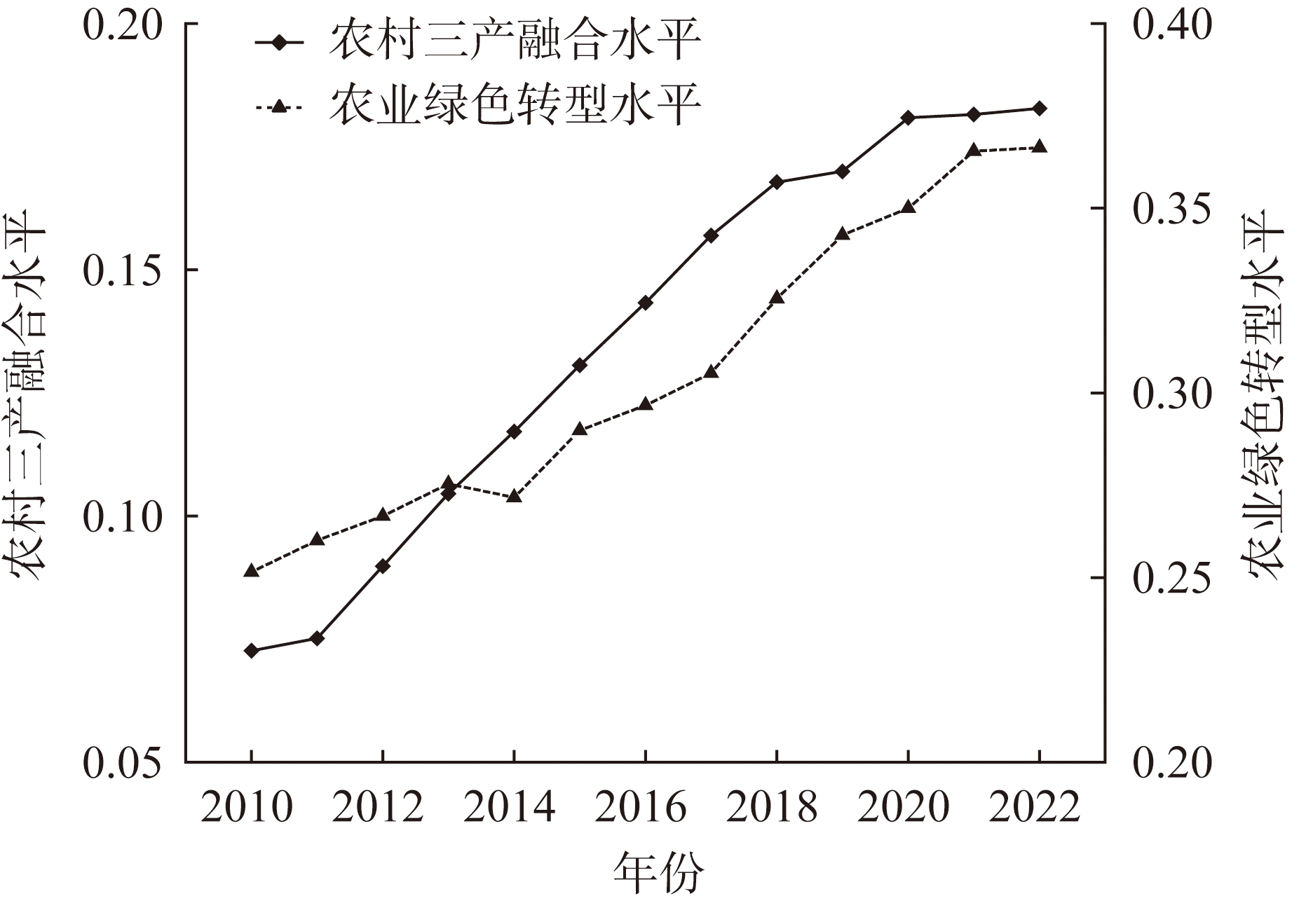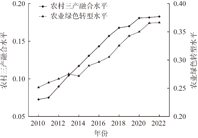 图1 农村三产融合与农业绿色转型水平测度时序特征Fig. 1 Temporal evolution of rural three-industry integration and agricultural green transformation level |