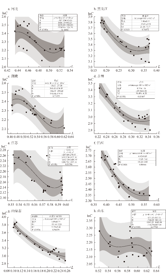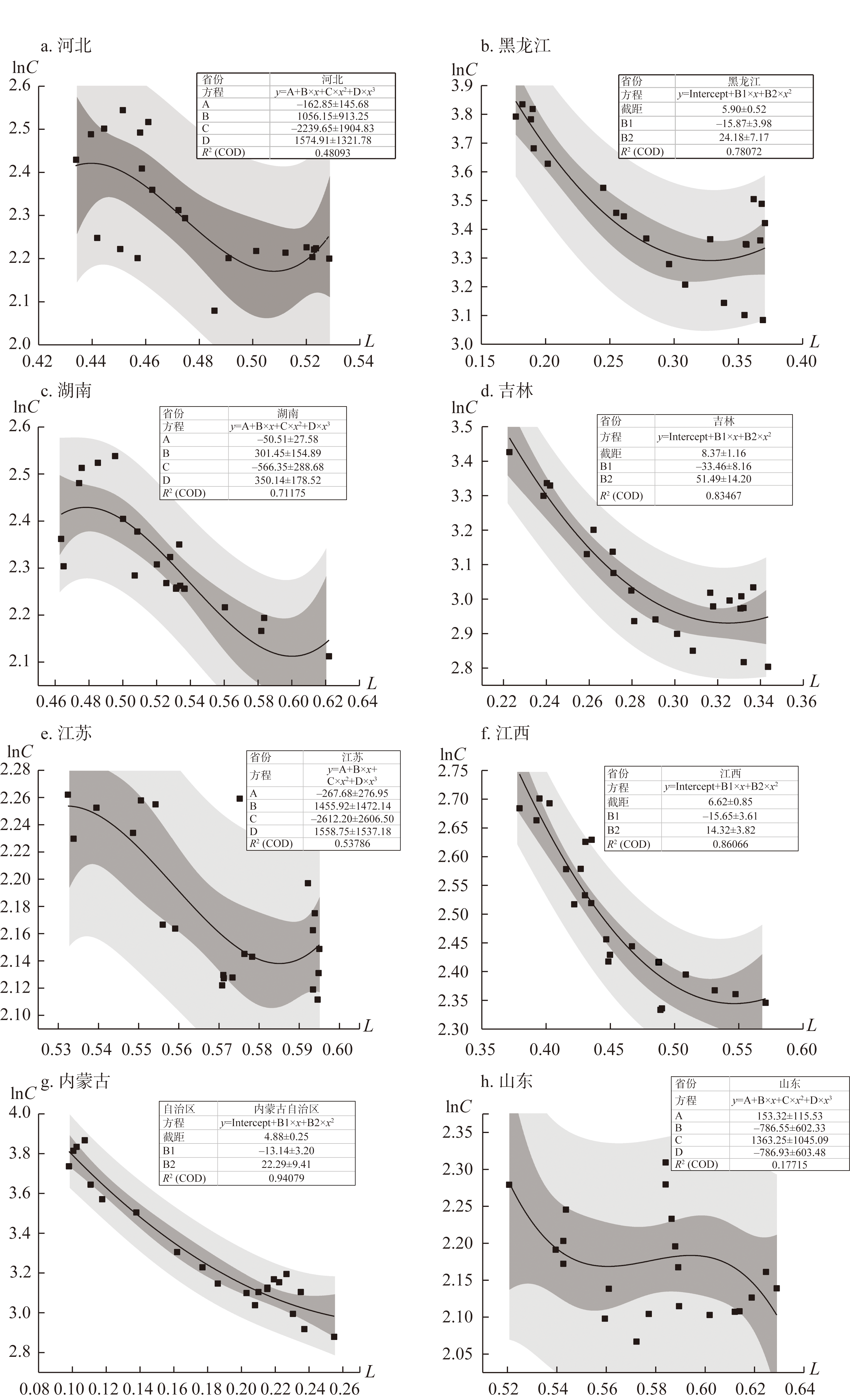 安徽 | lnC | -4.079(0.0068) | L | -4.413(0.0021) | 黑龙江 | lnC | -4.180(0.0048) | L | -4.756(0.0006) | |