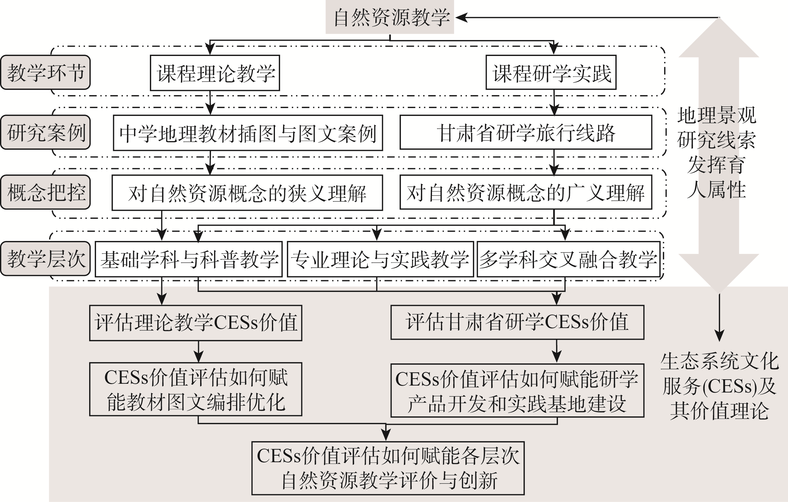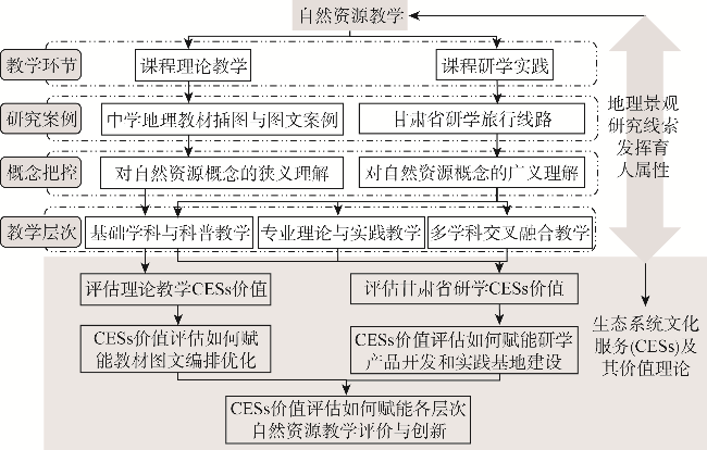 Based on the theory of cultural ecosystem services (CESs) and the simultaneous development of five educations, this study constructs a comprehensive framework to elucidate the mechanisms among landscape education, CESs values, and natural resources teaching. It compiles expert evaluations of illustrations from middle school geography textbooks and a collection of study-tour itineraries for Gansu province. Using methods including categorical statistics, kernel density estimation, and MaxEnt model prediction, the study assesses the CESs values of natural resources featured in middle school geography curricula and Gansu study sites, and explores pathways through which value evaluation can advance natural resources teaching. Findings indicate: (1) Digital landscapes convey the digital CESs values in theoretical teaching through multimedia courseware, textbook illustrations, and other forms. Students perceive the physical CESs values via observation, experience and research. The values of CESs provide a pivotal basis for selecting teaching materials and field sites. (2) The illustrations in chapters such as "Resources Security and National Security" carry high value. Mixed multiple illustrations layouts better express educational and spiritual values. Chapter cover illustrations convey aesthetic values, and educational and spiritual are strongly linked. Values evaluation informs textbook revision through the selection of graphic and textual cases, innovative arrangement methods, optimized visual effects, and exploration of ideological and political elements. (3) Study-tour courses in Gansu show overall agglomerative spatial distribution. Lanzhou city and surrounding counties are the main high-value areas for five types of CESs. The high-value areas in the Hexi Corridor are concentrated in oases and cities. Value distribution is highly correlated with the density of primary and secondary schools in the region. Values assessment guides study-tour product development and practical education-based construction. The research has practical significance in refining teaching strategies and objectives across educational levels, optimizing teaching resources, and linking of theory with practice in teaching.